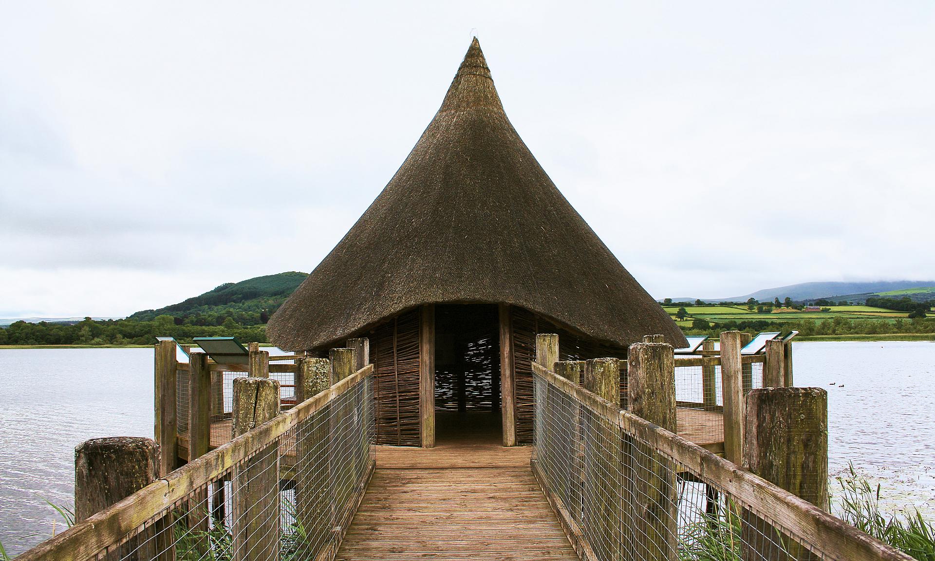 From the car park cross the little road, heading towards the lake. Follow signs for ‘The Crannog Centre’ to a wooden walkway. Walk along the wooden walkway to the hut with the thatched roof.