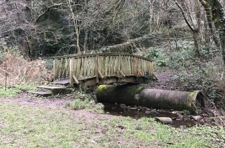 Continue past the ponds towards the wooden chalet hut. On your right notice the dry ski slope, another example of how the steep terrain of this valley has been put to use. Just beyond the chalet hut, the path becomes grass. Follow the grass path along the line of the valley until you see a small wooden bridge to your right. Head towards it and stop once you reach the bridge.