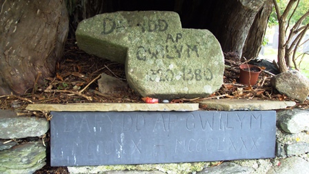 This tree is believed to mark the grave of Dafydd ap Gwilym, the most famous of Welsh medieval poets. Dafydd ap Gwilym lived almost seven hundred years ago and rumour has it he died of the plague in the fourteenth century. This simple marker represents his grave.