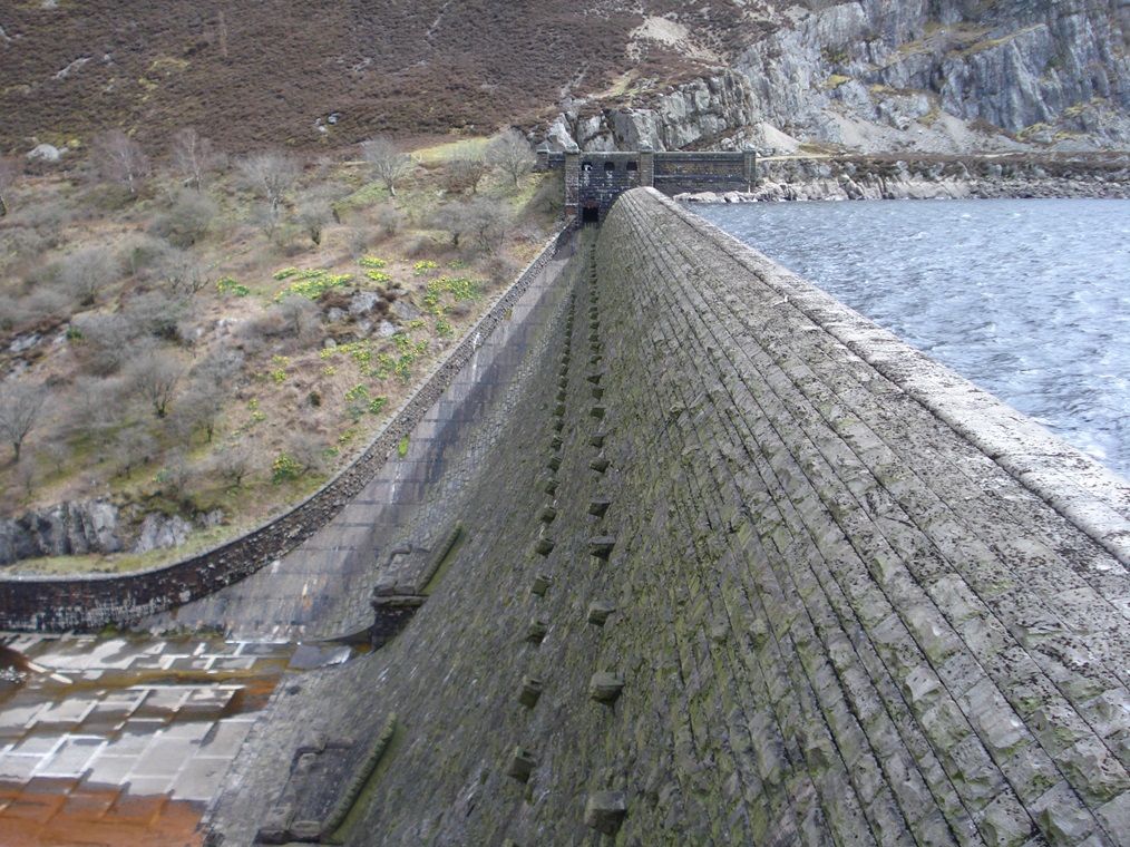 The top of this dam is 13 metres below the maximum water level so that there is a separate reservoir (Garreg Ddu) on this side of the bridge. Without this feature both reservoirs would need to be kept full in order to reach the height of the Foel extraction point.