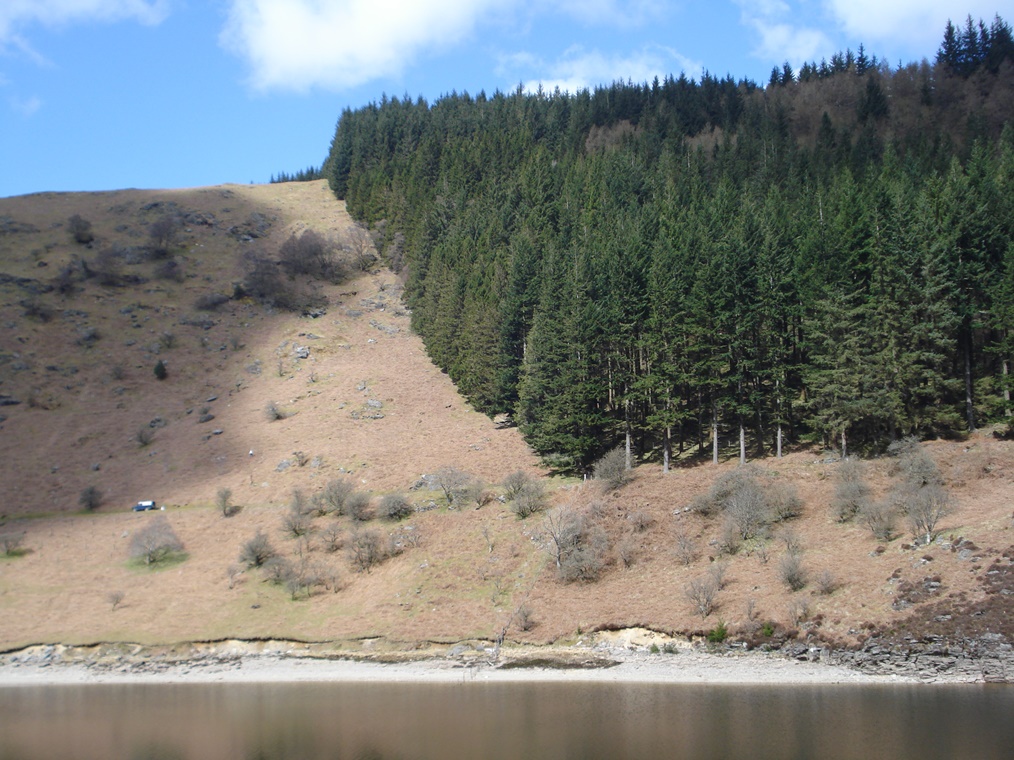 Look across the reservoir and you should be able to see the distinct difference between the rather scraggy Upland Oakwood on the lower part of the slope and the regimented plantations of conifers above.