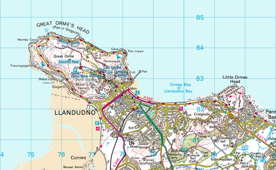We’re on the coast of North Wales, which stretches from the Dee Estuary in the west to the island of Anglesey in the east. Look at a map and you will see that most of the North Wales coast is relatively straight but Llandudno juts out. It is a ‘peninsula’, a strip of land that projects into the sea from the mainland and surrounded on three sides by water. The curved bay that you can see from here – the North Shore – is one of the sides; the hill behind you where steep cliffs fall down into the sea is the second side; and the West Shore which you can just glimpse is the third side. If you look at an OS map you will be able to appreciate this layout better.