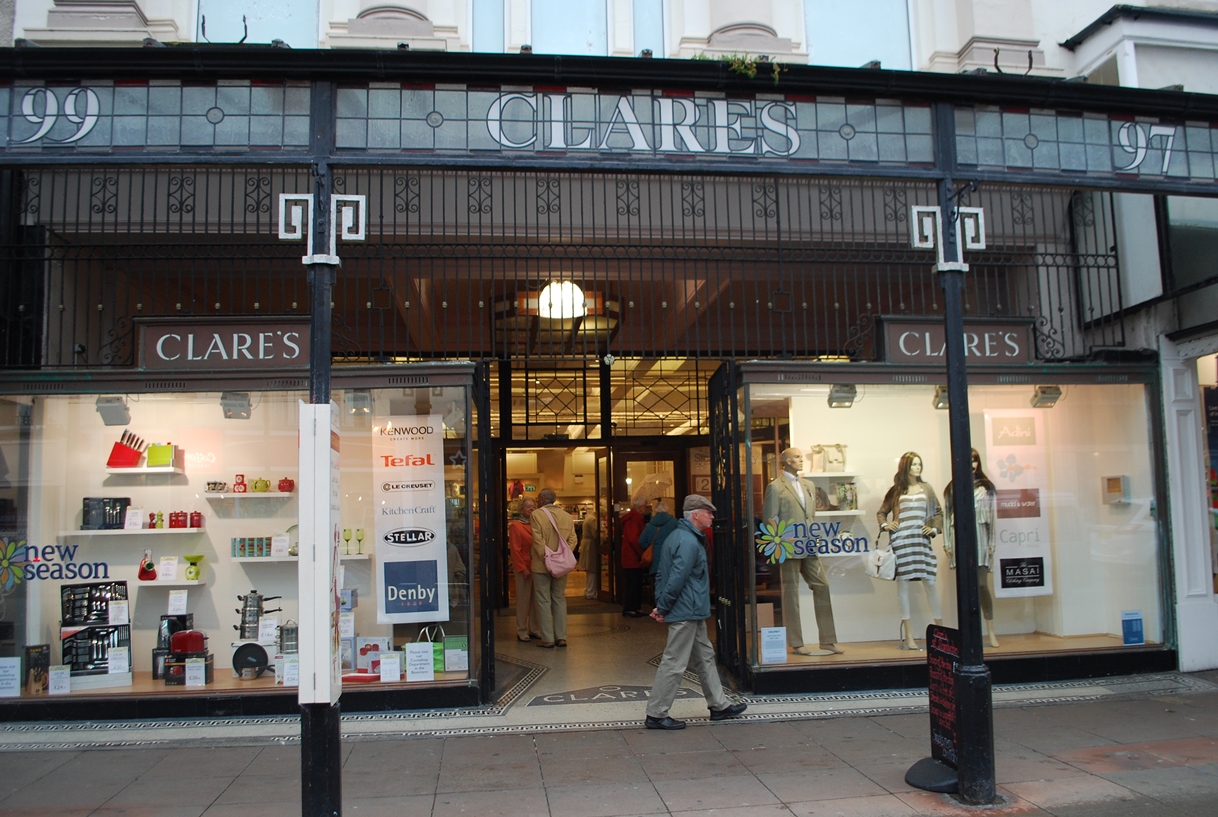 Look at the verandas on the front of many of the buildings with decorative glasswork giving the name of the shop. There are good examples here next to Barclays Bank and at WH Smiths. Decoration was an important part of building design to the Victorians as it helped to emphasise the importance of a building and of the people who were using it, but here the decoration has a function as well because these structures provided shoppers protection from the rain.