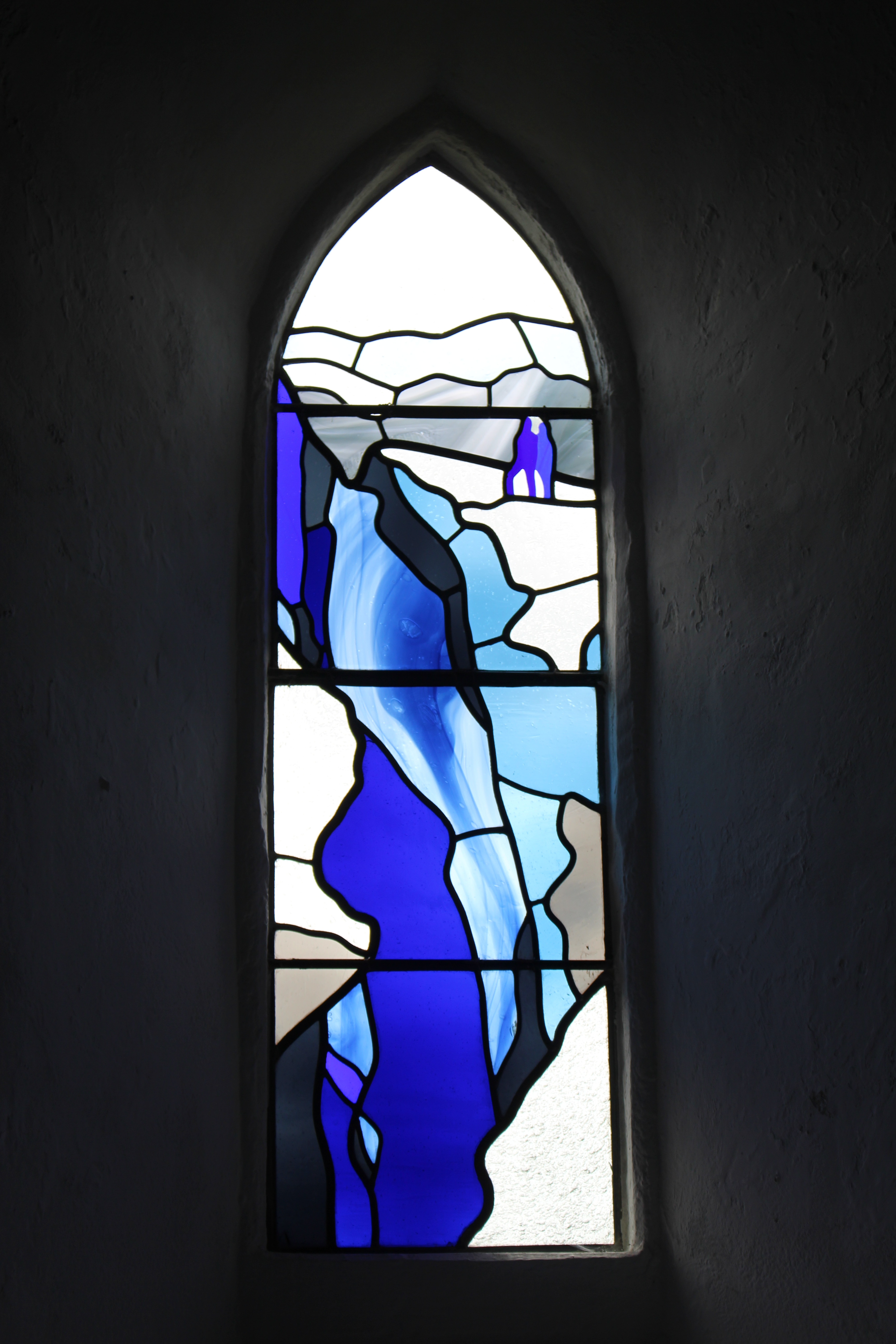 You might not make an immediate connection between Rhossili and the Antarctic (except on a very cold day!) but inside this church we can find one. Go in and look for a blue and white stained glass window, showing a glacier with figures on top.