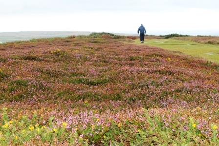 We’re now walking across Rhossili Down. Compared to the patchwork of neatly hedged fields we can see ahead, this scrubland might seem a bare and unproductive landscape. But this is a rare heathland habitat.