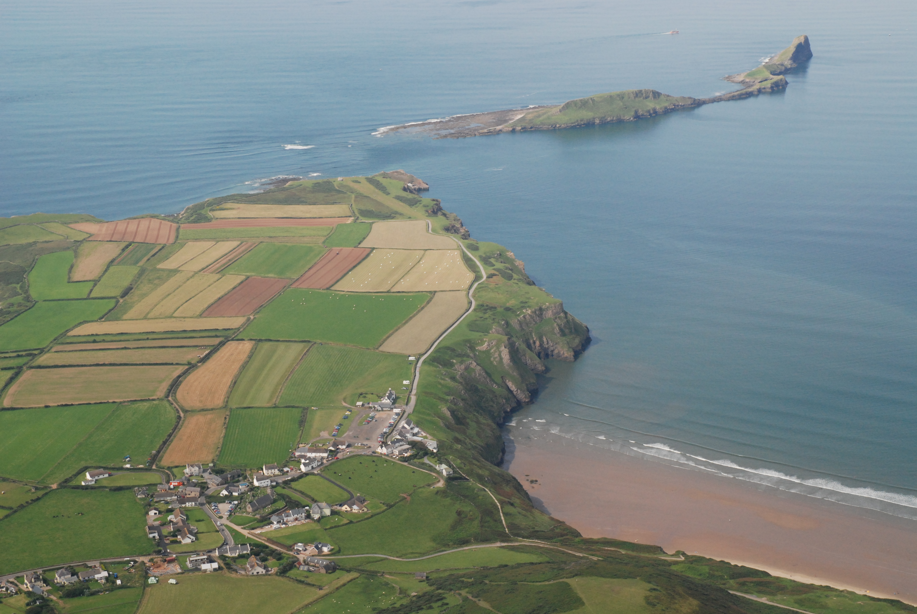 Look to the left and inland from Worm's Head. Can you can spot a patchwork of fields? This area, known as The Vile, is one of the few places in Britain where arable farming is still practiced using the medieval 'open field' system. The land is divided into long thin strips, marked out by earth banks and drystone walls.