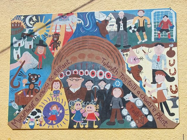 This mural was created by local children as part of a project to raise awareness of the history, traditions and heritage of the area within the local community. It is a good place to stop and summarise what we have learnt about the Teifi Valley on this walk.