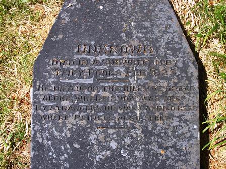Stand with your back to the church and facing the yew tree, follow the sunken path left leading away from the church towards the stone wall. Follow the wall to the left and stop under the trees where you’ll find a flat gravestone that reads ‘Unknown’.