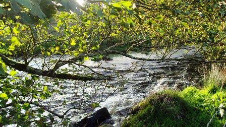 Follow the rough pathway along the Teifi River (following the walking route signs) over a stile. Head towards the corner of the fence on your right, noticing the face of a quarry on your right. Continue across the field keeping the river on your left and just left of the line of telegraph wires and mounds of stone. At the bottom of the field near a large tree cross over the stile into the next field. Cross over the next stile and notice the confluence of the rivers Teifi and Glasffrwd on your left. Follow the walking route signs over three more stiles, before stopping along the path when you are parallel to the white farmhouse and farm buildings on the hillside on your right.