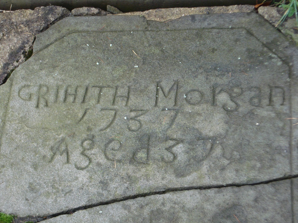 Go through the gate into the churchyard. If the church is open it is well worth going inside. Beside the gate is the west door. Go to the right round the corner to the south door. On the far side of the south porch is the grave of Griffith Morgan.