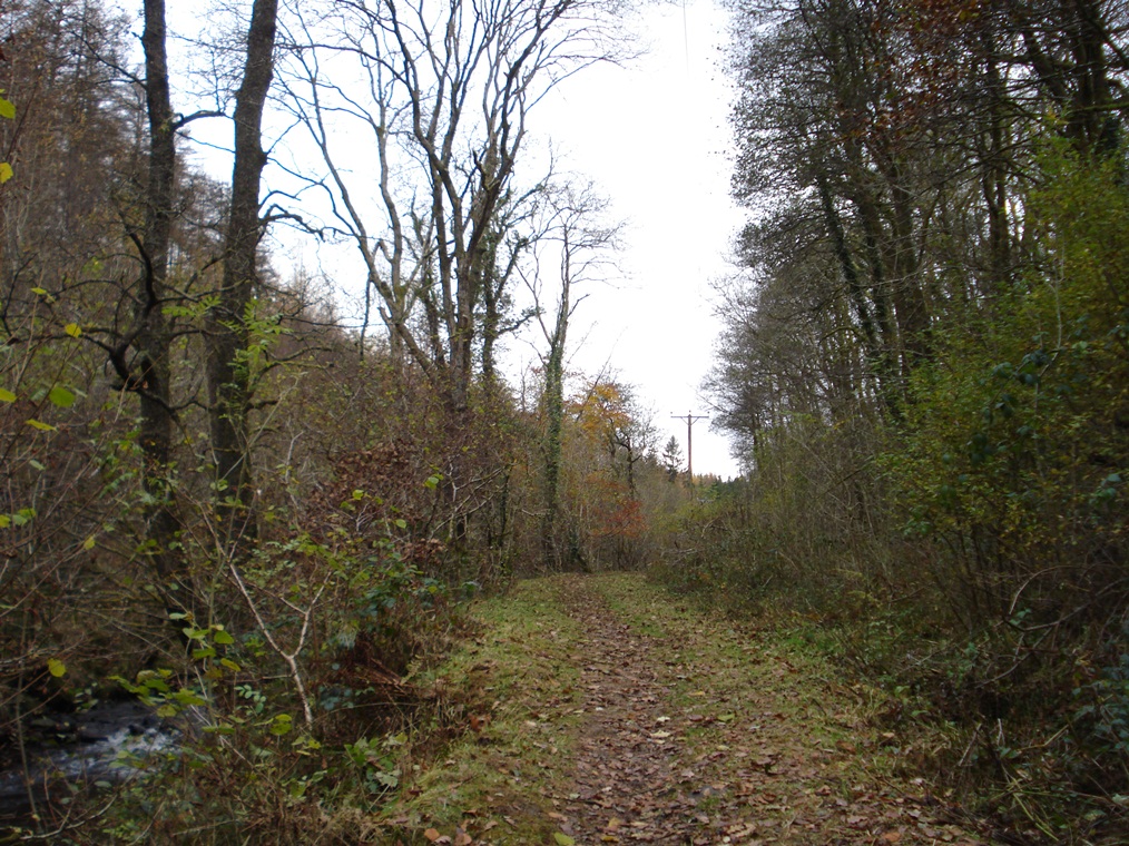 Follow the path towards the farmhouse and then diagonally downwards below the grounds of the farm. Continue following the path diagonally down the hillside. When you are almost beneath the overhead power lines and close to a pylon look for a small quarry below. Stop here.