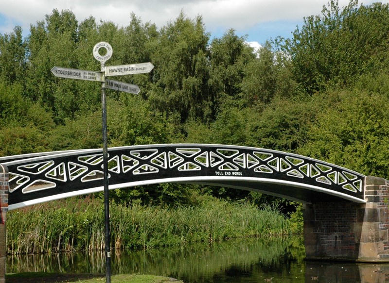 Turn left and head towards the metal bridges of Windmill End Junction. Keep the Dudley Canal on your right and continue onto the nearest metal bridge. Stop halfway across it.