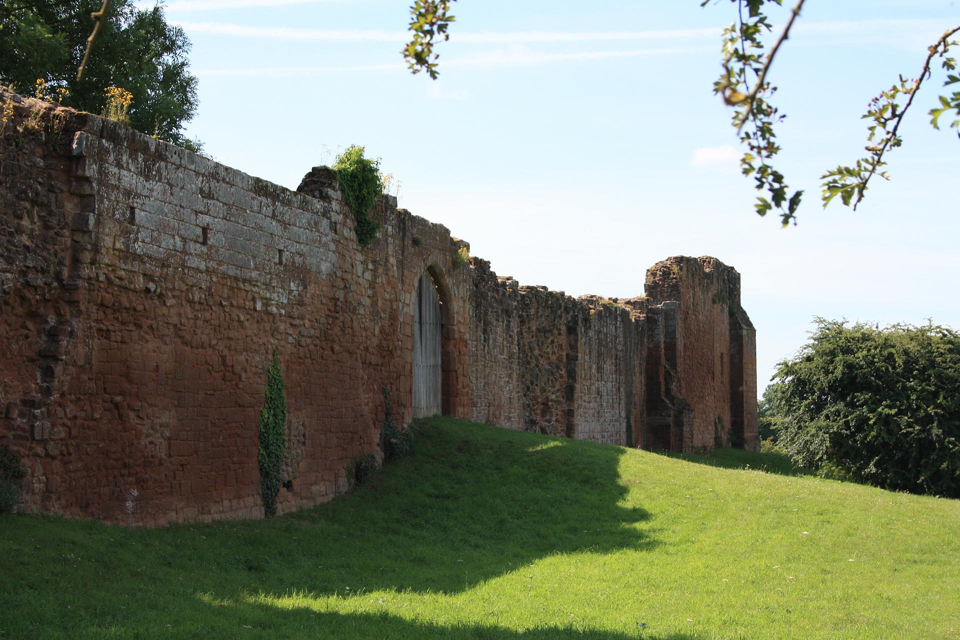 Before we move on, take a closer look at the castle walls. Did you notice their lovely warm orange-red colour? The castle is built of New Red Sandstone, which was mined locally. From where we’re standing by the outer walls it is clear the castle sits on higher ground above the meadows below. Geoffrey de Clinton, who built the first castle here in the early 1120s, chose the location because of this natural knoll, or hill. It meant the castle looked out over the surrounding area and was more difficult to attack.