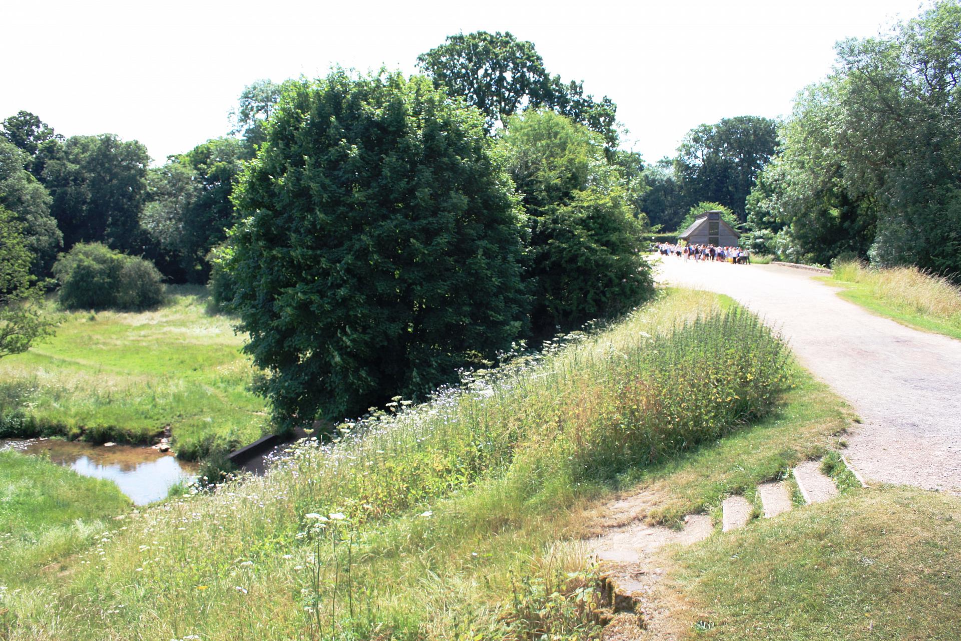 There are meadows, fields and hedgerows aplenty but there is no lake, and the castle is about as far from the coast as you can get. So why did they build a water gate? The next stop on our trail will reveal the answer but for now look over to the lowest point in the meadow to our right. The line of trees and shrubs marks the course of a small brook.