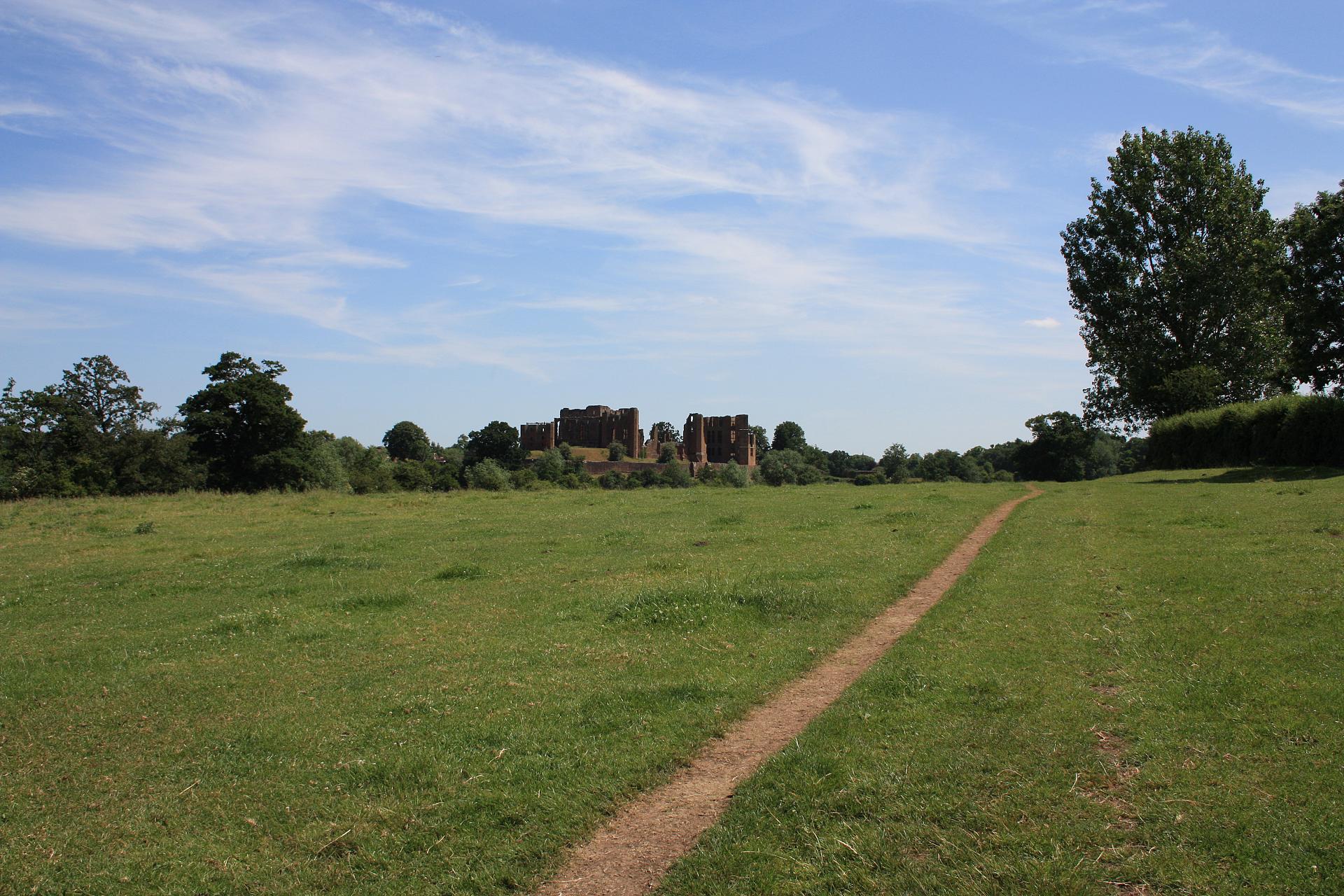 With your back to the castle, walk along the causeway, past the ticket office and cross a small bridge over a ditch to reach the road. Turn right and after a few paces leave the little road and follow the footpath down to your right to a gate with footpath sign. The gate is labelled ‘Kenilworth Millennium Trail’. Pass through here and walk a short way along the footpath until you have a good view of the castle to your right across the meadow.