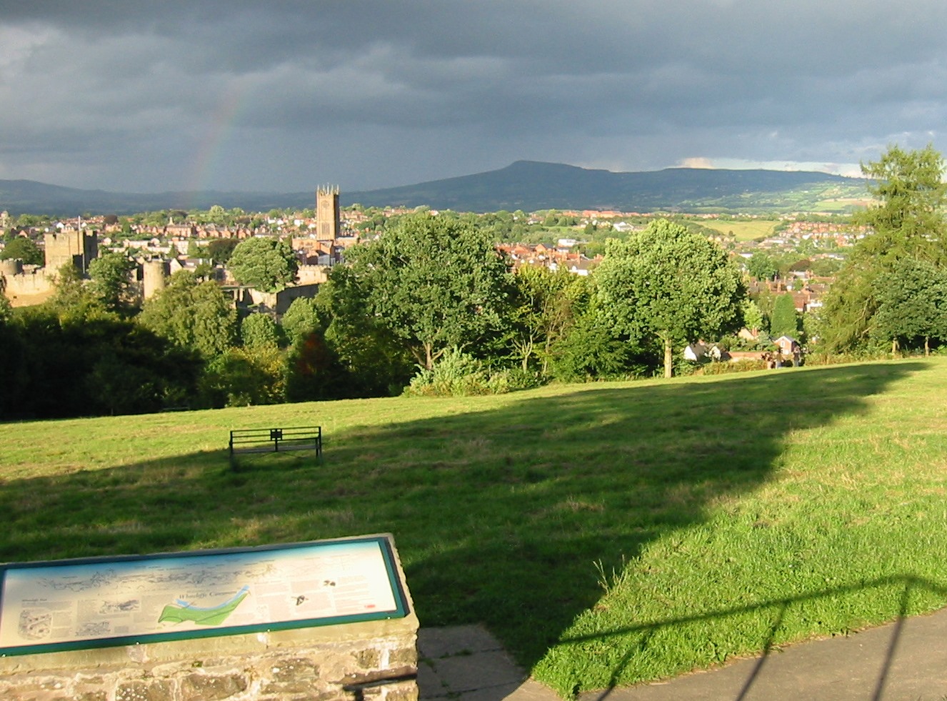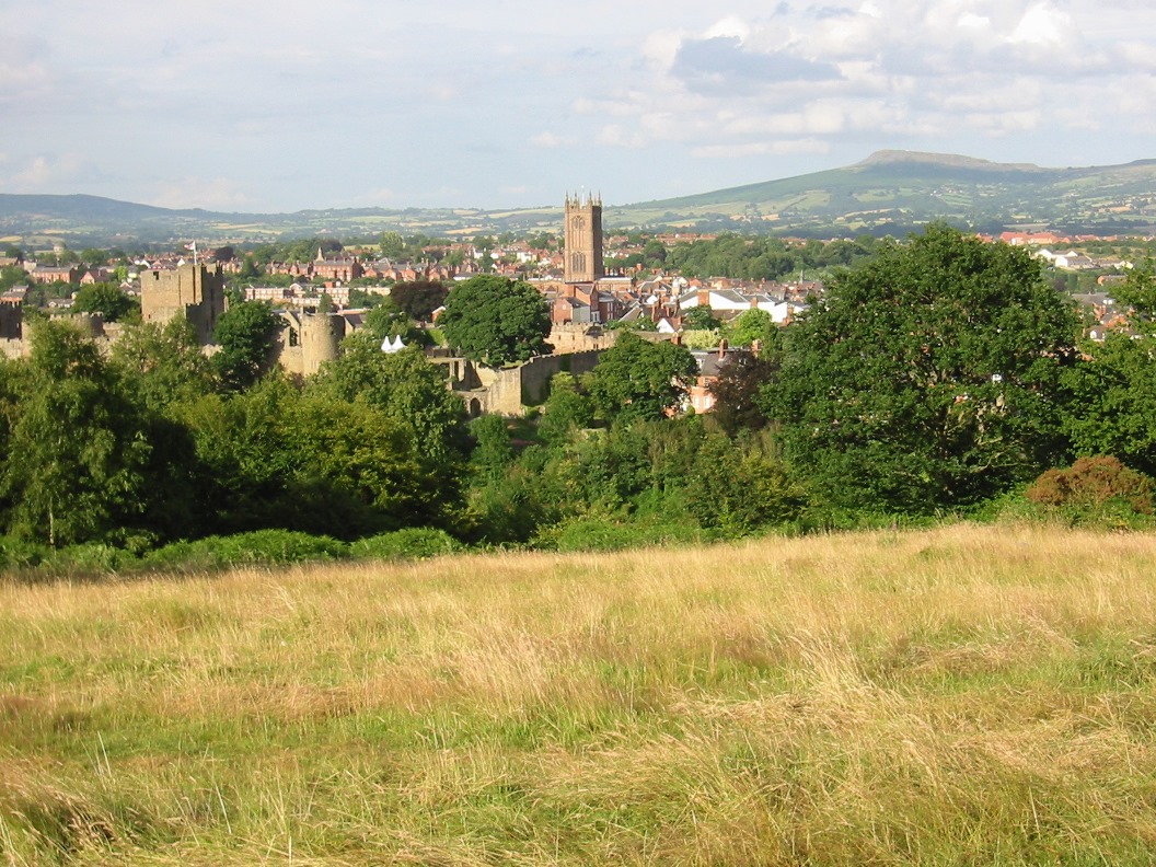 The town of Ludlow lies on a bend in the River Teme. It’s also set within an area of lowland at the foot of the Clee Hills that are visible rising up in the distance.