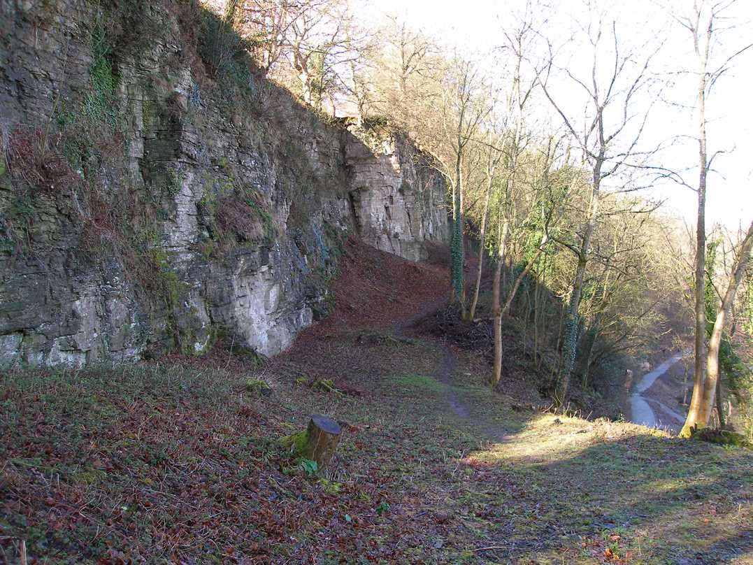 Continue along the Bread Walk. Pass the end of the weir on the left and go up the uneven stone steps. At the top of the steps are two benches. Stop here and look back into Whitcliffe Quarry. The quarry has been disused for two centuries and stones may fall from the quarry face so do not approach the rock. Keep to the path!