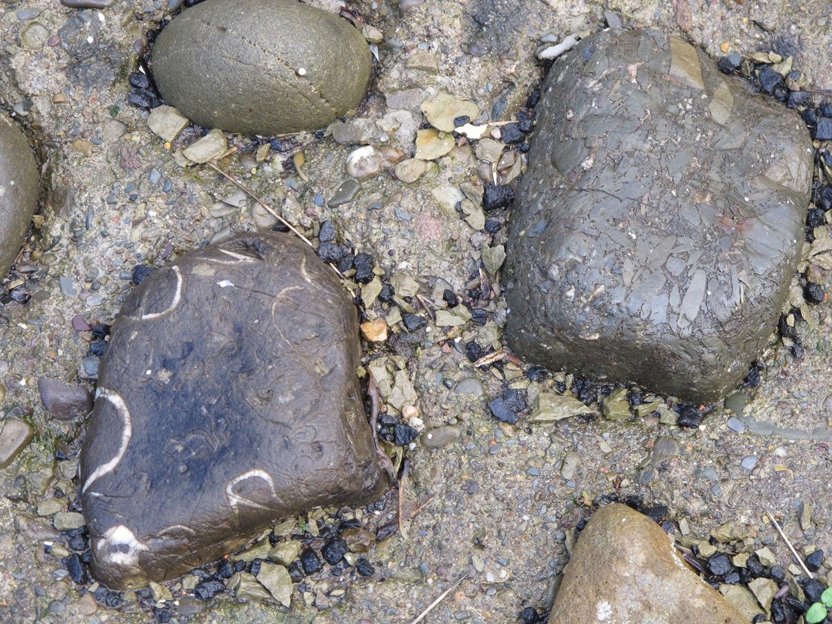 These cobbles are of rock types that are geologically old, from the Lower Palaeozoic period 400 to 500 million years ago. They come originally from rock outcrops further north.