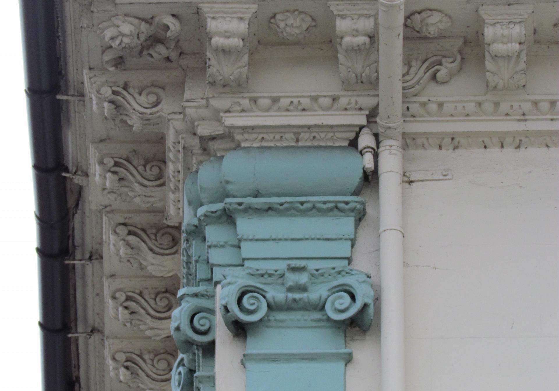 The junction of these four streets was a special exception included in the post-fire building code – here each building on the junction was allowed to be three stories in height. To add dignity to the junction the corners are each, in turn, decorated with Ionic, Doric and Corinthian columns.
