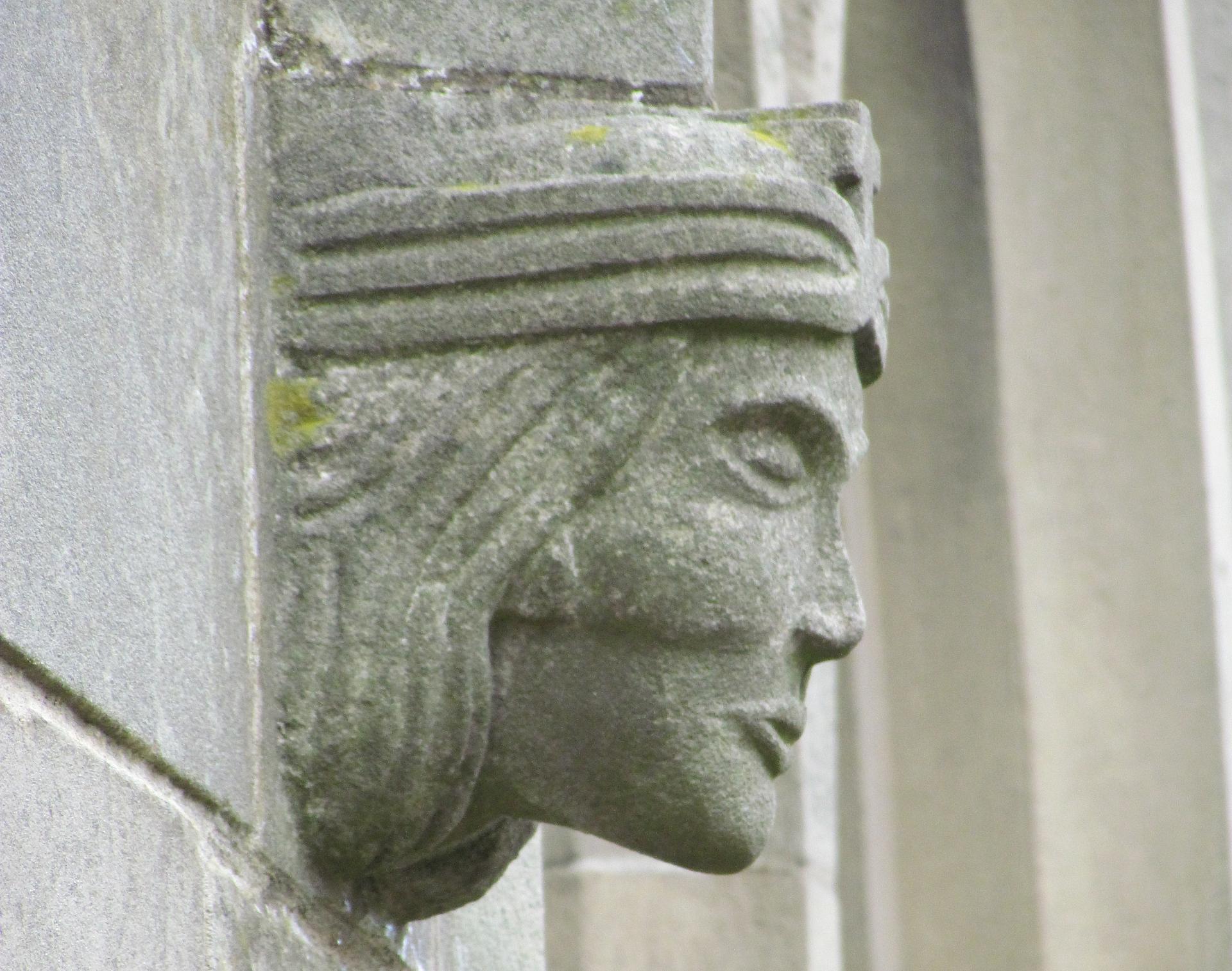 As we go through the gate, we can see just how soft the local sandstone is. Look for the mason’s chisel marks on the harder stone higher up. Also note the early pillar box to the right. It was cast in the form of a Doric column in 1856.