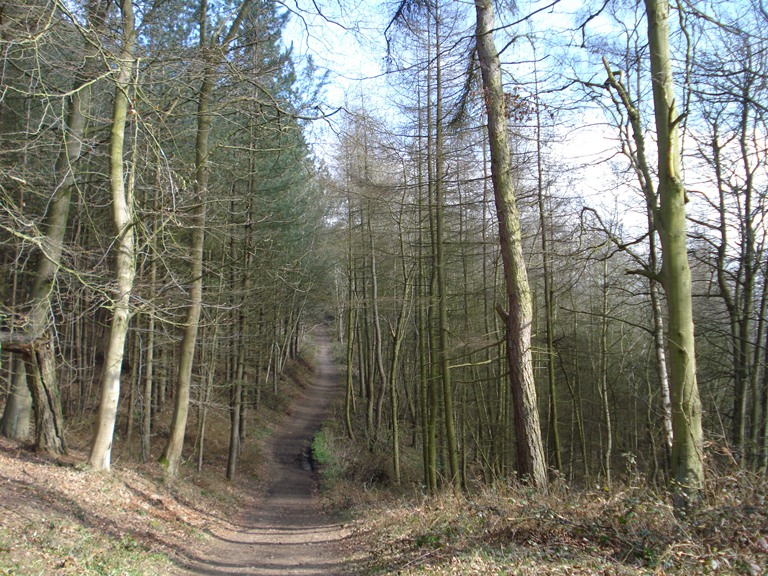 Continue on the path as it undulates through the woods. After about half a mile, a path joins from the right hand side and there are fields down to the right of the path. Stop after the fields end and you have woodland on both sides of the path.