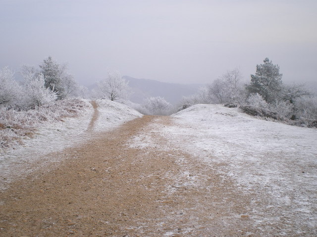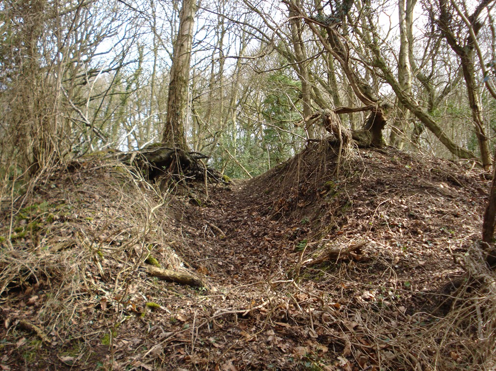 From the trig point, follow the path as it descends from the summit through the embankments of the hilltop settlement. After a short way the path leaves open ground and enters into woods. It descends very steeply and great care should be taken, particularly if the ground is wet.