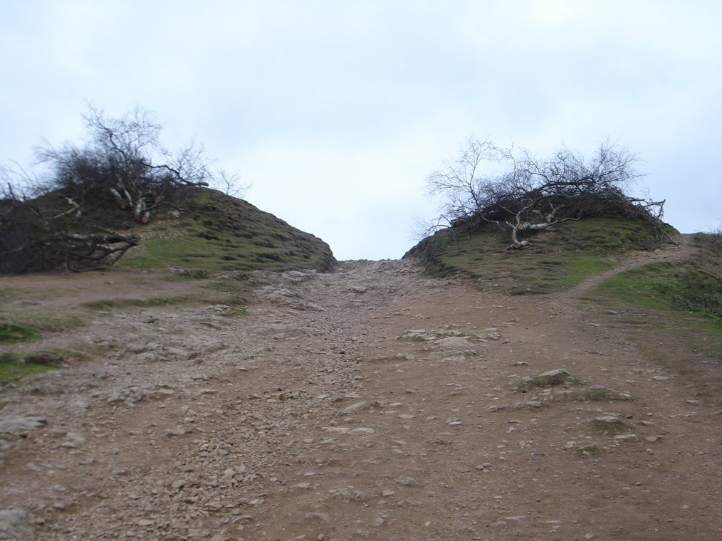 Look up the slope and you should be able to see that the path goes between two earth embankments. This was the outer entrance to a large hillfort. Having struggled your way up here you may wonder why on earth people would have wanted to live on the top of a mountain!