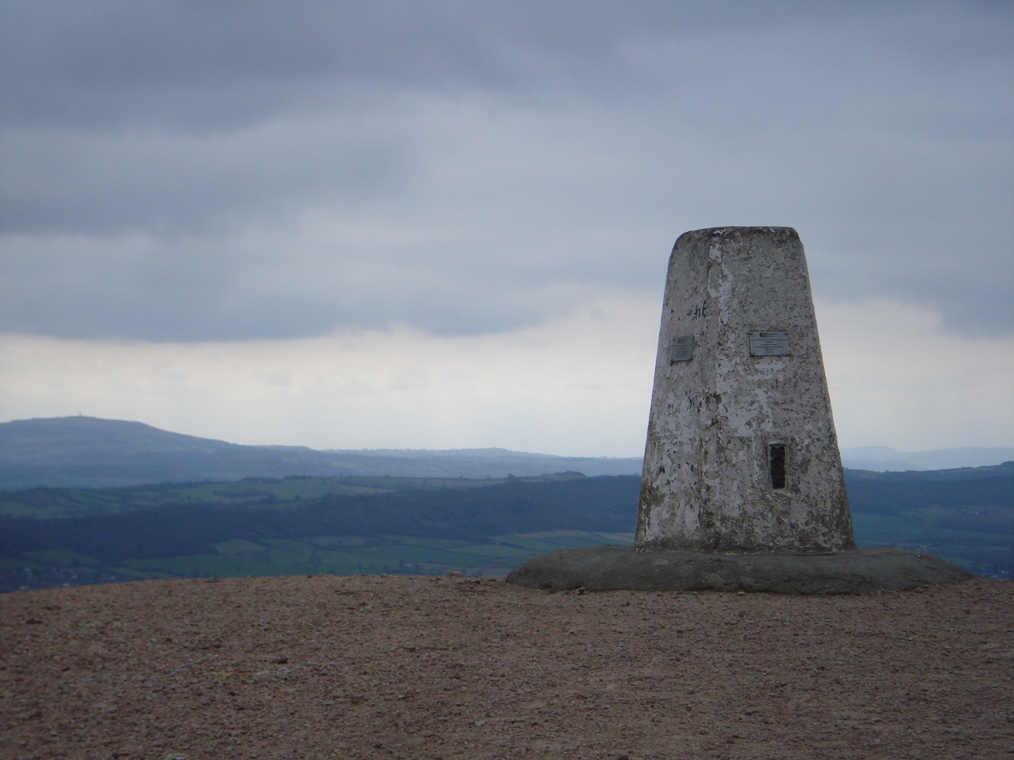 Continue on the main path upwards. Go past the communications mast. Stop at the trig point (white column at the summit).