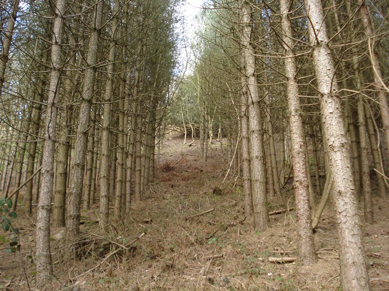 Shortly after passing a ruined building, you reach a farm track. Take the waymarked footpath on the left running into the woods. Stop part-way along the first straight section of path.