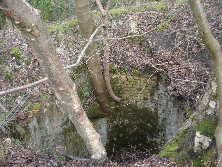 Follow the path as it descends gradually through the woods still following the route of the Jinny rail. At the next split in the paths, keep straight. Where paths merge and split and there are farm buildings to the right, take the left fork. After a short distance, look on the left hand side for an old quarry and on the right hand side for two brick shafts. Stop here.