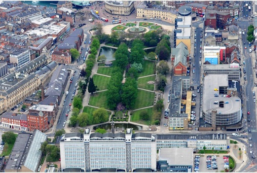Continue along Lowgate Road, which turns into Wilberforce Drive, until you reach the very tall monument – the Wilberforce Monument (behind which is Hull College). At the monument turn left, cross the pedestrian crossing and enter the Queen’s Gardens. Take the steps down to the left into the gardens and walk around the edge of the pond to its mid-point. From here you will see a footpath leading down the centre of the gardens between avenues of trees.