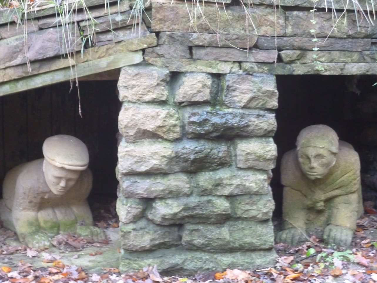 From the road, go through the opening into Nabs Wood. Go past the information board and down the steps. Cross the bridge over the stream and look on the left at a low stone sculpture featuring two crouching figures.