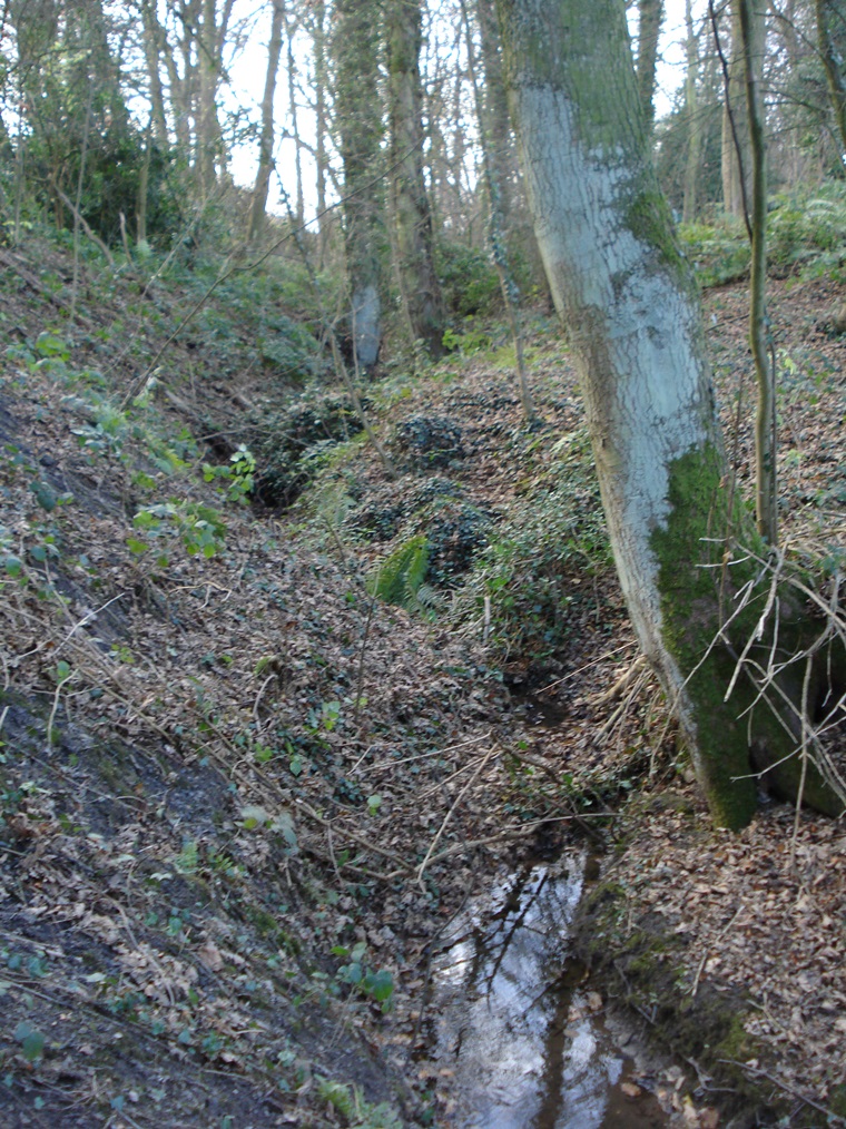 Continue following the path through the woodland as it ascends steadily. After a short distance look for a large hole to the left of the path with a wooden rail around.