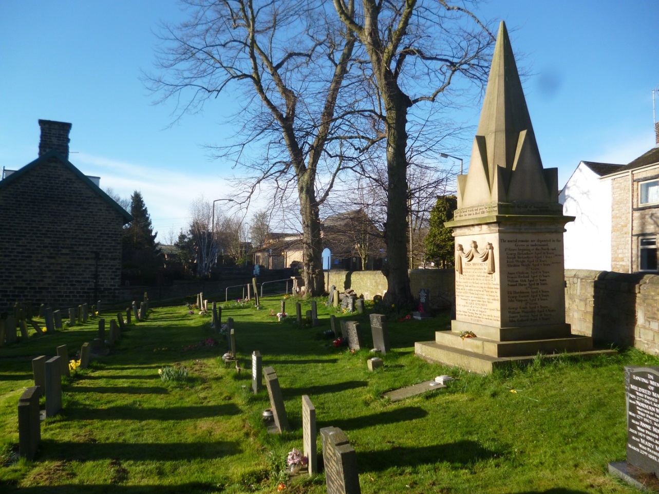 Continue along Silkstone Lane until you reach a major junction opposite the church. Cross over the road carefully (this corner can be busy) and go straight on into High Street. Walk along the pavement beside the wall of the churchyard until you are alongside a large stone memorial with a pyramidal apex. Go to Stop 16.